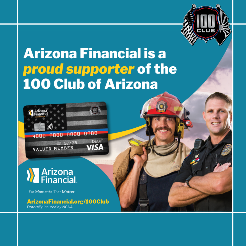 Arizona Financial Credit Union members can make a difference in the community with the100 Club of Arizona Visa® debit card. For every card issued Arizona Financial makes an annual donation to the 100 Club. Get yours today at arizonafinancial.org. We are so grateful to have the support of AZFCU!